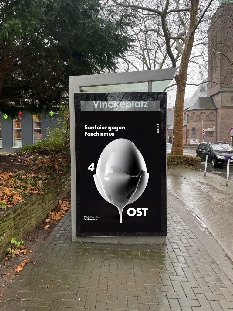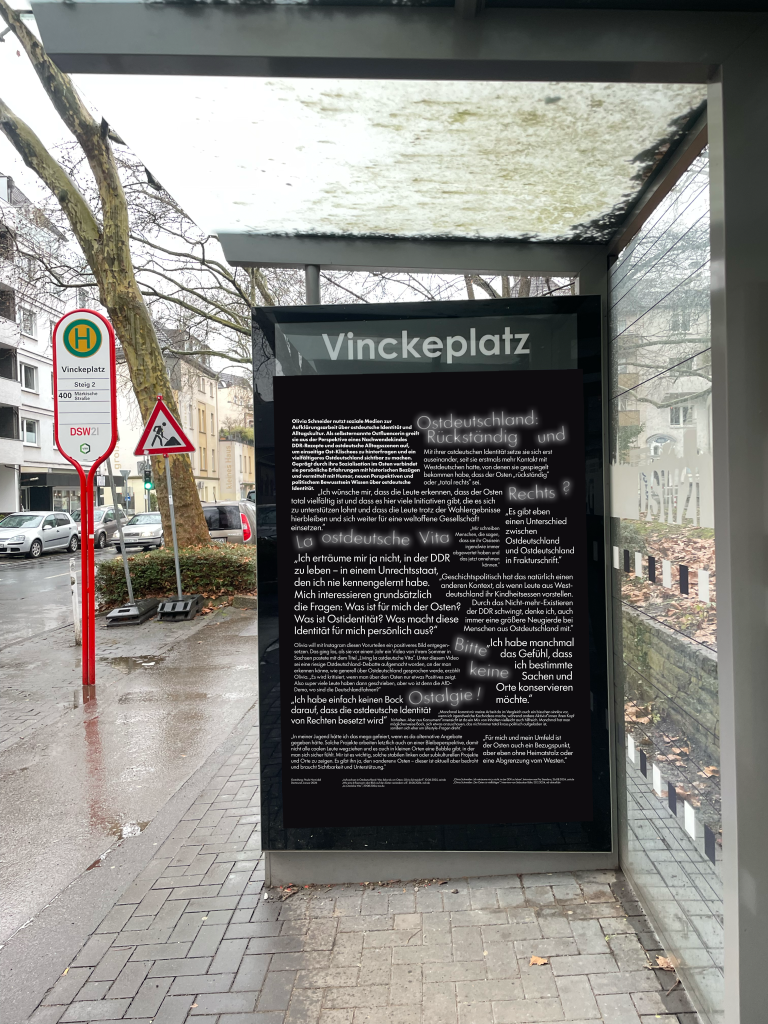 In einer dreiteiligen Edition werden antifaschistische Positionen von drei Protagonist*innen sichtbar gemacht, die in Ostdeutschland aufgewachsen sind und sich kritisch mit ostdeutschen Lebensrealitäten und Diskursen auseinandersetzen. Zitiert werden die selbsternannte Ostfluencerin Olivia Schneider, der Aktivist und Autor Jakob Springfeld sowie die Autorin und Journalistin Valerie Schönian. Visuell werden die Aussagen unterstützt durch typische DDR- bzw. Ostprodukte.