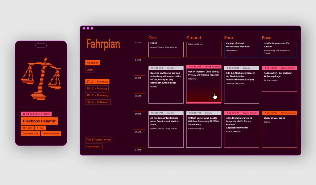 Der Chaos Computer Club (CCC) ist Europas größte Hackervereinigung. Sein jährlicher Congress mit 160+ Vorträgen, 4 Tagen und über 16.000 Teilnehmer*innen ist das ideale Anwendungsfeld für eine dynamische visuelle Identität: Das Erscheinungsbild muss skalierbar sein, kurzfristige Änderungen ermöglichen und eine Community befähigen, die Open Source, Remixen und kollektives Weiterentwickeln als Grundhaltung lebt.