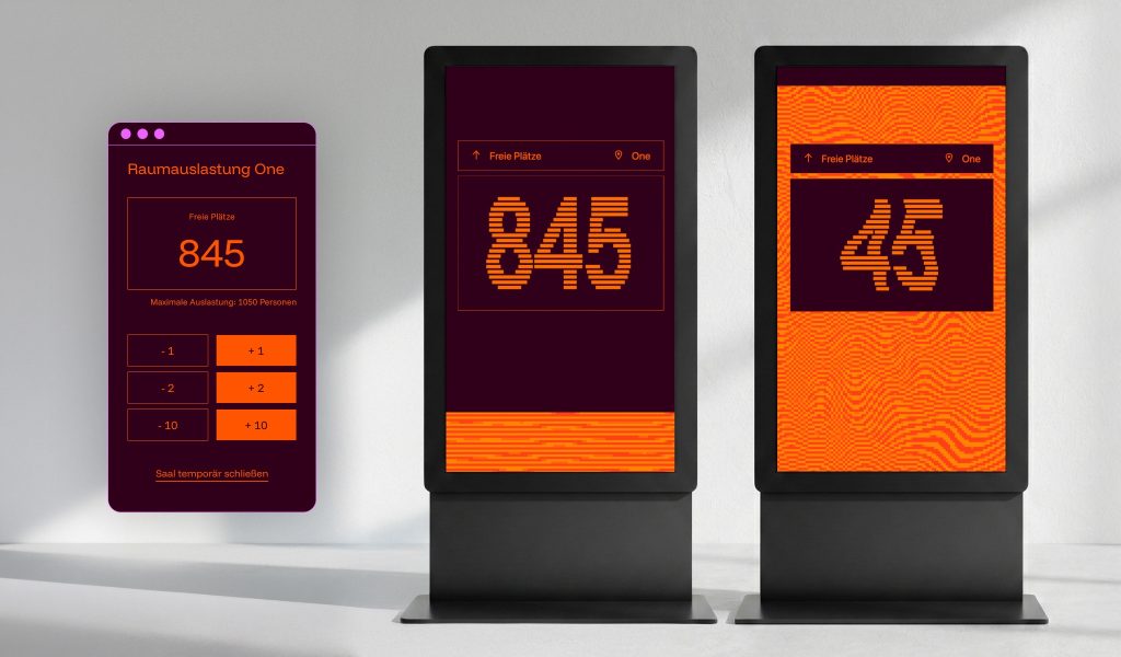 Reaktive Elemente koppeln das Design an seine Umgebung: Im digitalen Leitsystem steuert die aktuelle Saalauslastung in Echtzeit die Intensität der Animationen. Speaker-Intros werden live im Browser gerendert, Inhalte bleiben bis zum letzten Moment änderbar.
