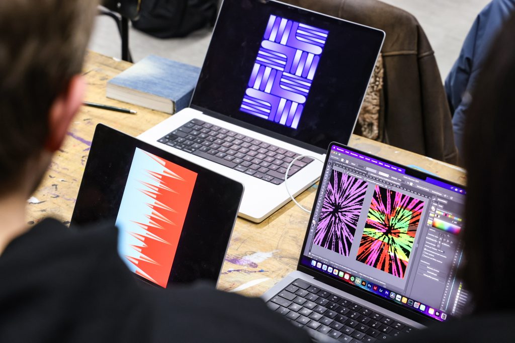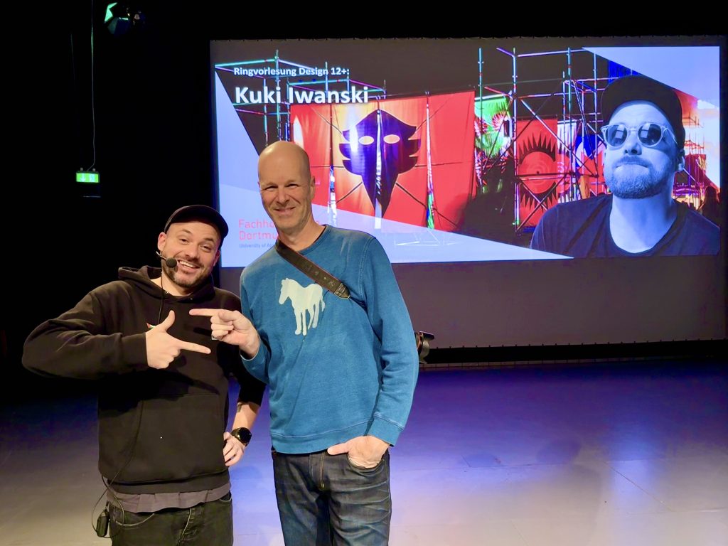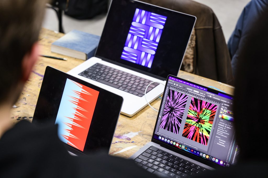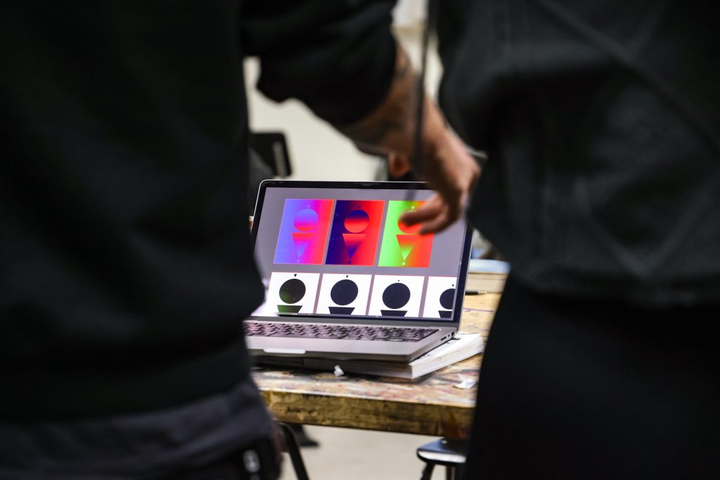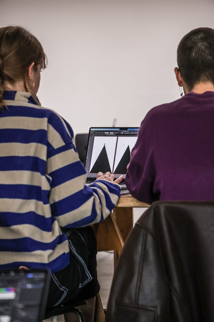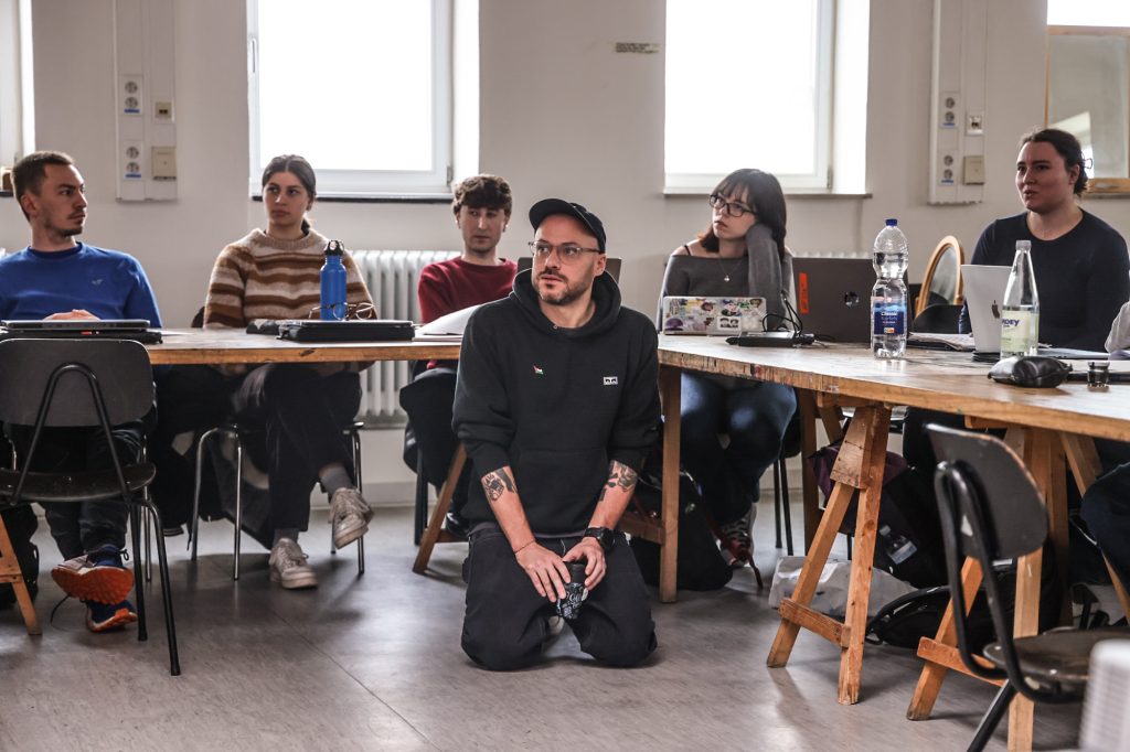 The workshop was followed by a lecture in which Kuki Iwański introduced his artistic practice. Working across identity, installation and print, his work investigates how symbols, colour and form influence collective experience. He is widely known for his experimental flags and large-scale spatial interventions, including the ongoing project Ghosts of Tomorrow, exhibited in cities throughout Europe and Asia. His visual language is bold and highly reduced, often critically engaging with consumerism, memory and the transformations of contemporary life. Alongside commissioned work, he continues to develop long-term artistic projects that explore clarity, reduction and the communicative power of imagery in public space.