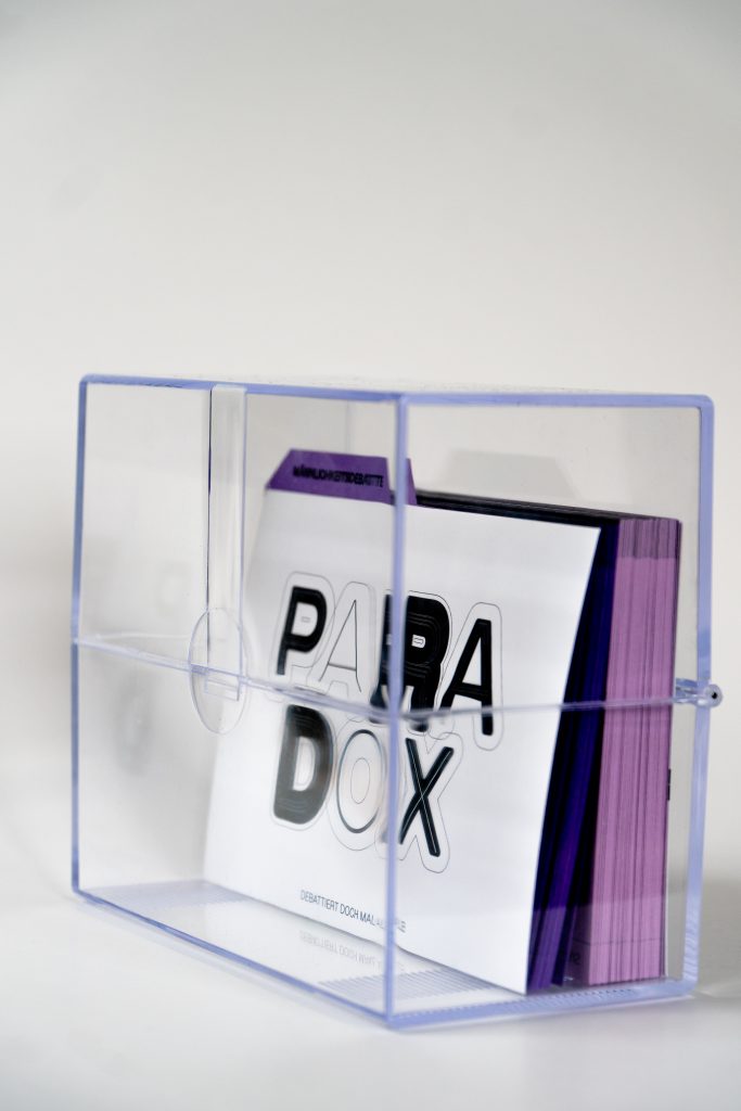 Als Antwort darauf entwickelte Antonia PARADOX: Ein monatlich erscheinendes Debattier-Set, das gesellschaftlich relevante Themen greifbar macht. Jedes Set umfasst fünf klar unterscheidbare Positionen zu einem Thema. Die Spieler*innen übernehmen Rollen, die nicht ihre eigenen sind, und debattieren anhand von Faktenkarten. Ein*e Moderator*in lenkt die Diskussion mit provokativen Fragen und Impulsen.